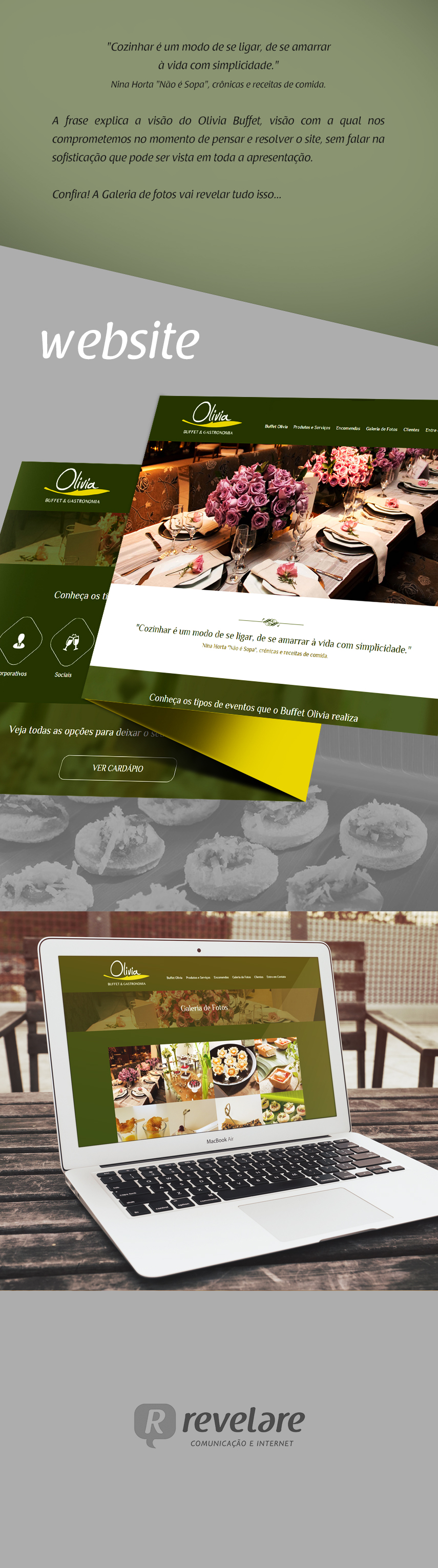 A frase explica a visão do Olivia Buffet, visão com a qual nos comprometemos no momento de pensar e resolver o site, sem falar na sofisticação que pode ser vista em toda a apresentação.