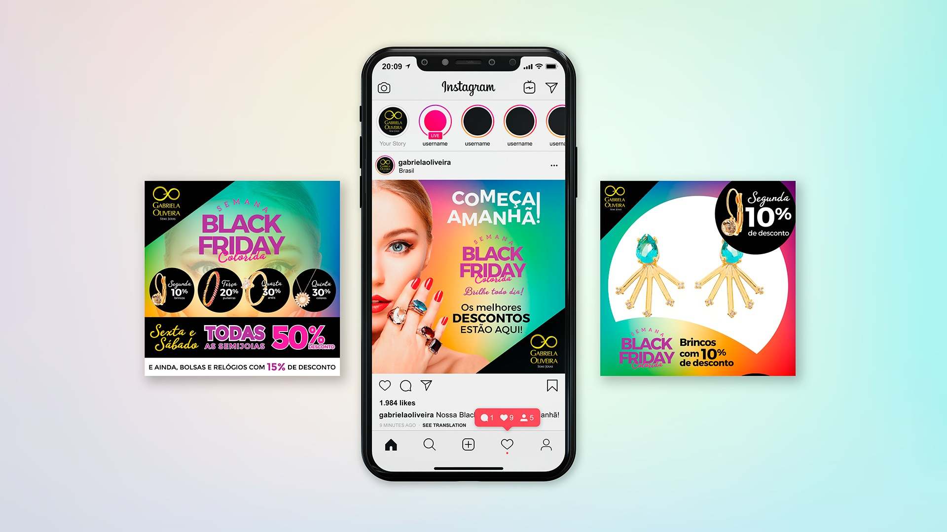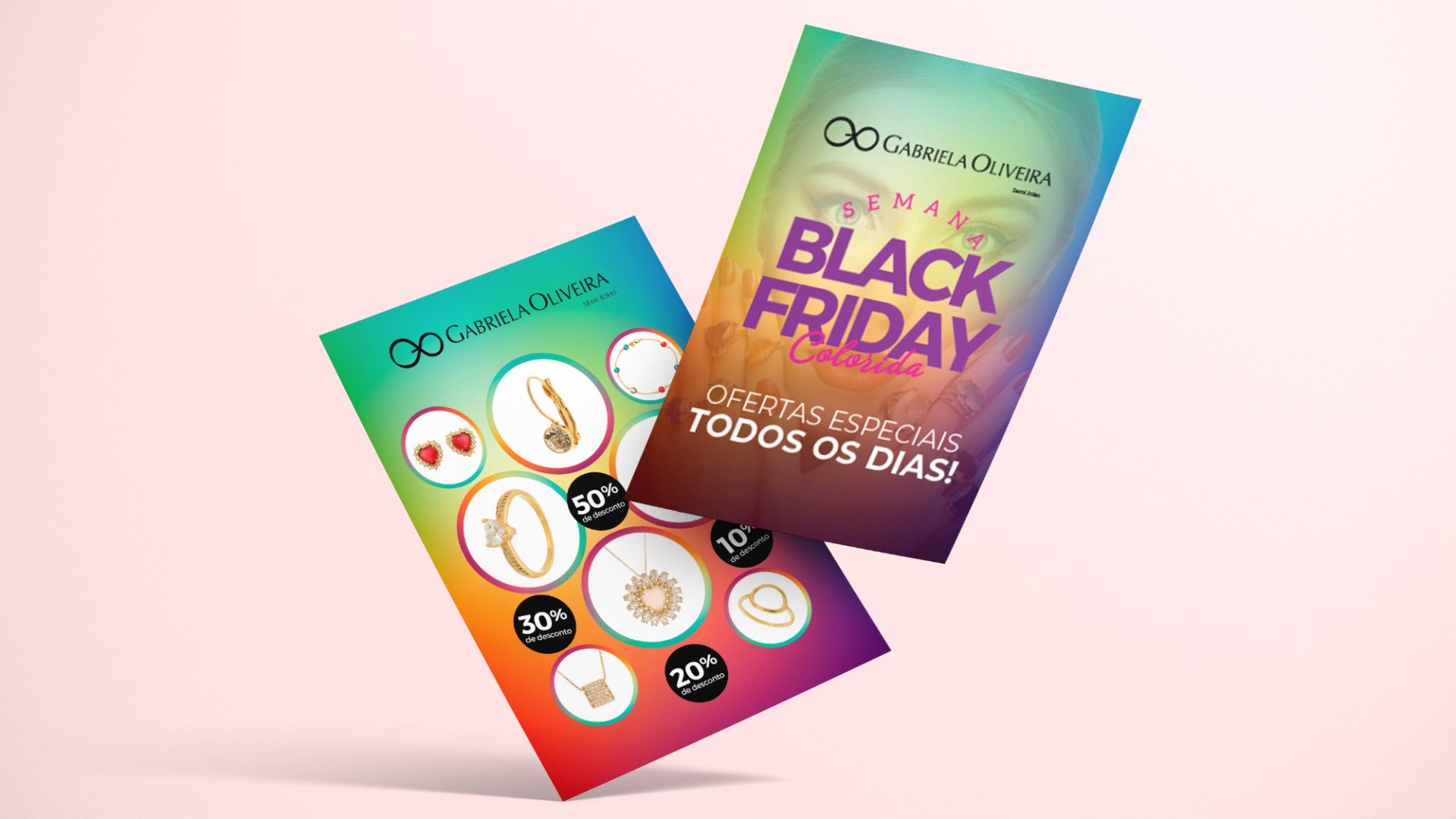 Com a proposta de realizar uma Black Friday criativa, a marca Gabriela Oliveira buscava uma promoção original. Com o contraste do preto tradicional, que domina essa época, a Revelare apresentou uma proposta ousada para sair do monocromático e colorir essa campanha.